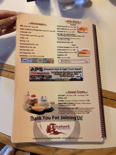 Tomahawk Family Restaurant offers amenities such as Accepts Apple Pay, Accepts Contactless Payments, Takeout, Good for Kids, Parking Lot, No Alcohol, Accepts Credit Cards, ensuring a comfortable and convenient experience for clients.